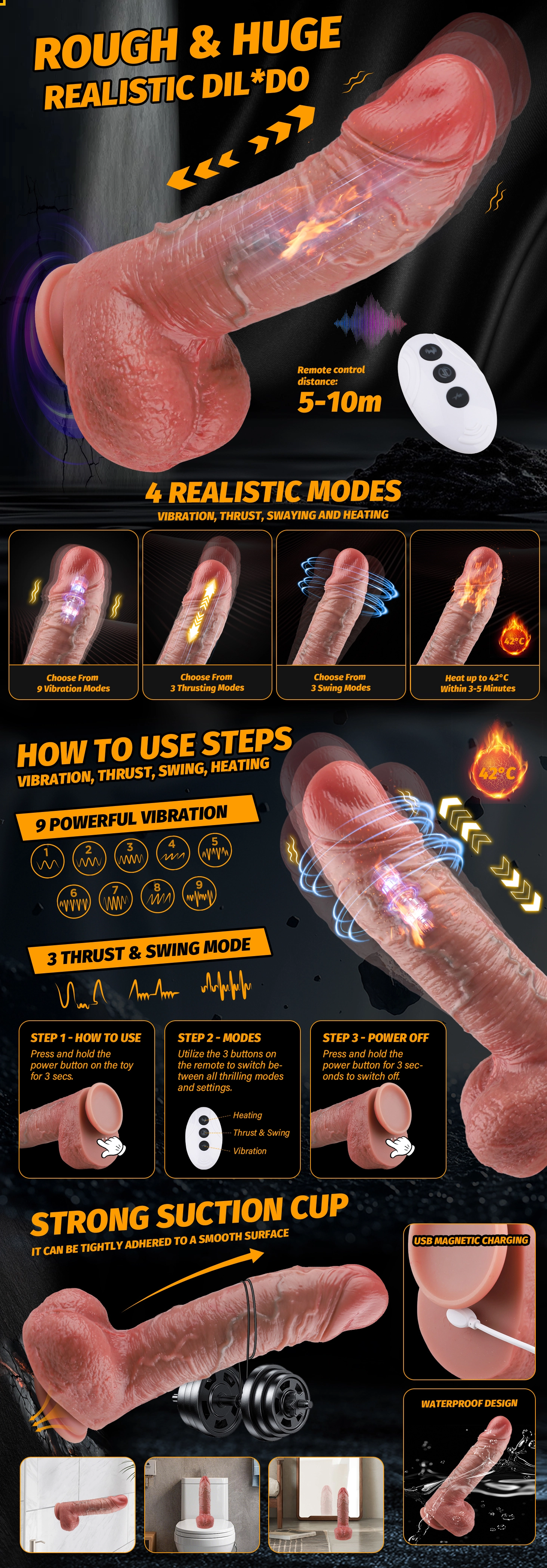 Hugo’s Thick Vibrating Thrusting Dildo (10.24" x 2.28"), satisfying pleasure for up to 40 minutes of play! Crafted from body-safe silicone, it features 7 thrusting modes and 3 vibration modes for customizable stimulation. The fixable suction cup ensures secure, hands-free action wherever you desire.